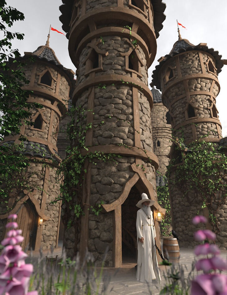 A collection of 5 mystical, stone wizards towers, shrouded in mystery and hidden menace.