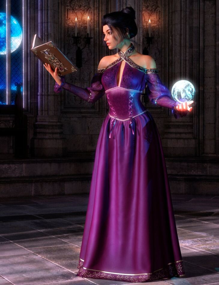 The Magical Arts dForce Outfit for Genesis 8.1 Females includes a long dress, with an option to hide the dress and match with pants, a corset, mask, and pants. The dress works with dForce but it is rigged if you want to fit it depending on the poses. The corset is also rigged with cords that move and adjust depending on the pose. They all have 6 different colors.