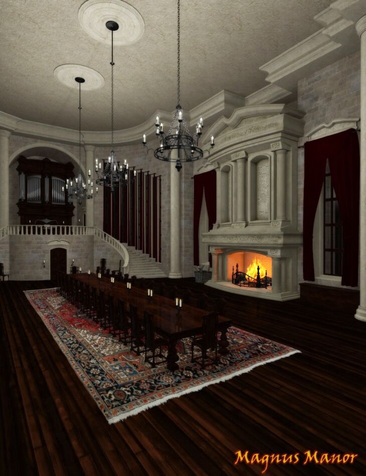 Magnus Manor is a highly detailed, carefully textured and complete interior set inspired by the huge halls of some British castles seen in various fantasy and historical movies. The scene is composed by the main structure, a long table with chairs, a fireplace, a pipe organ, wrought iron ceiling, wall and table light fixtures, and various other props (wardrobes, shields, chests).