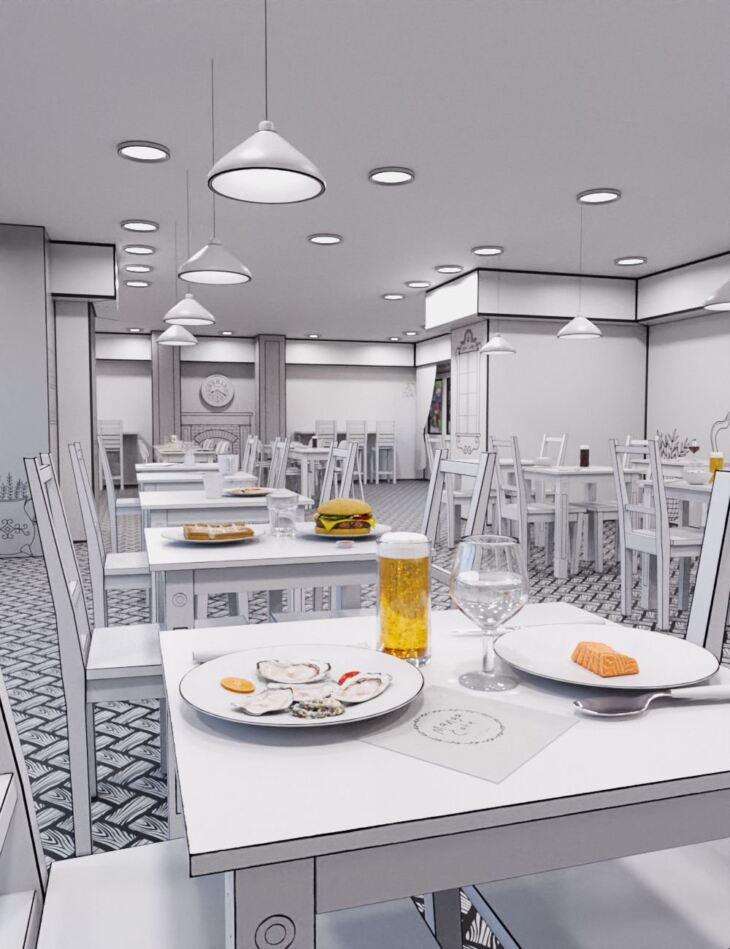 This cafe comes with dozens of props, from design and architecture (pillars, chairs, tables) to complete dishes and beverages (beer, soda, sushi, chicken, oysters, etc.).