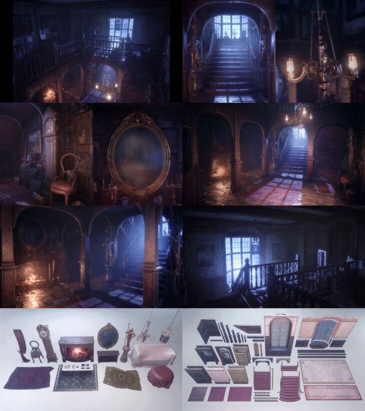 This immersive environment takes you back to a seemingly abandoned Mansion Hall set in the late 19th century. The decor is inspired by classic horror games and provides you with modular meshes, props, and materials for building one of your own.