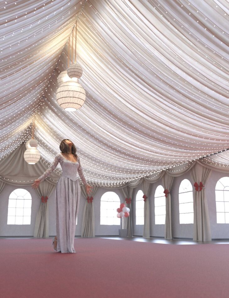 Marquee Party is a 20 by 10 meter luxury marquee with star-effect LED ceiling lights and luxurious draped fabrics. Get it today for a truly opulent party.