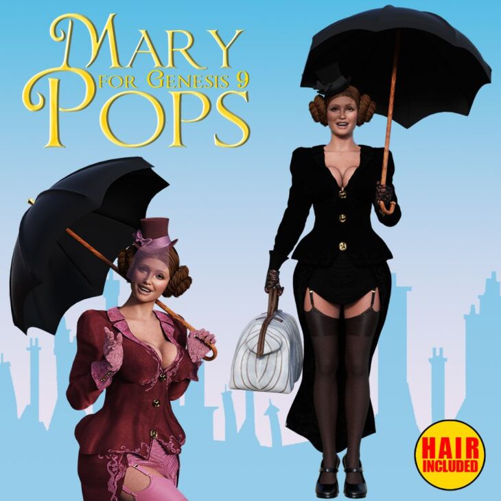 Mary Pops for Genesis 9 - Clothes, Hair, Props, Shapes.