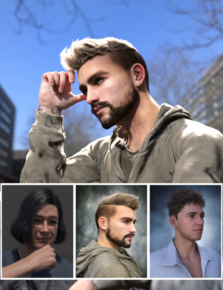 Get the Masculine Hair for Genesis 9 Bundle to give your male characters styles suitable for any scene.