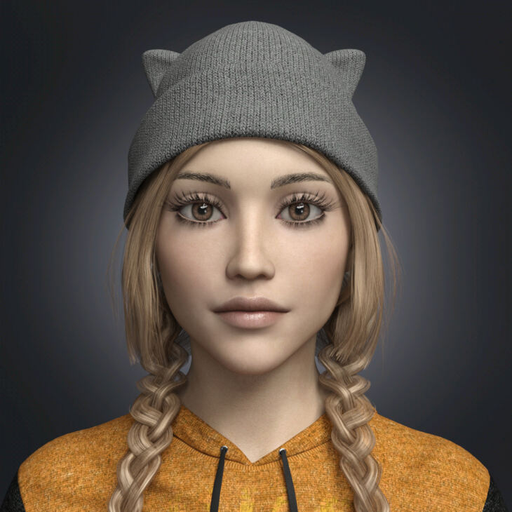 She features unique skin textures, head and body morphs, anatomical elements, and a full range of eye colors, makeup, and nail options.