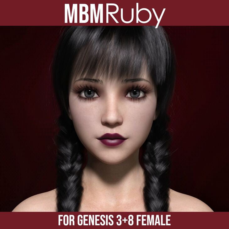 MbM Ruby is a beautiful custom character for Genesis 3 and 8 Female. She features unique skin textures, head and body morphs, anatomical elements, and a full range of eye colors, makeup, and nail options.