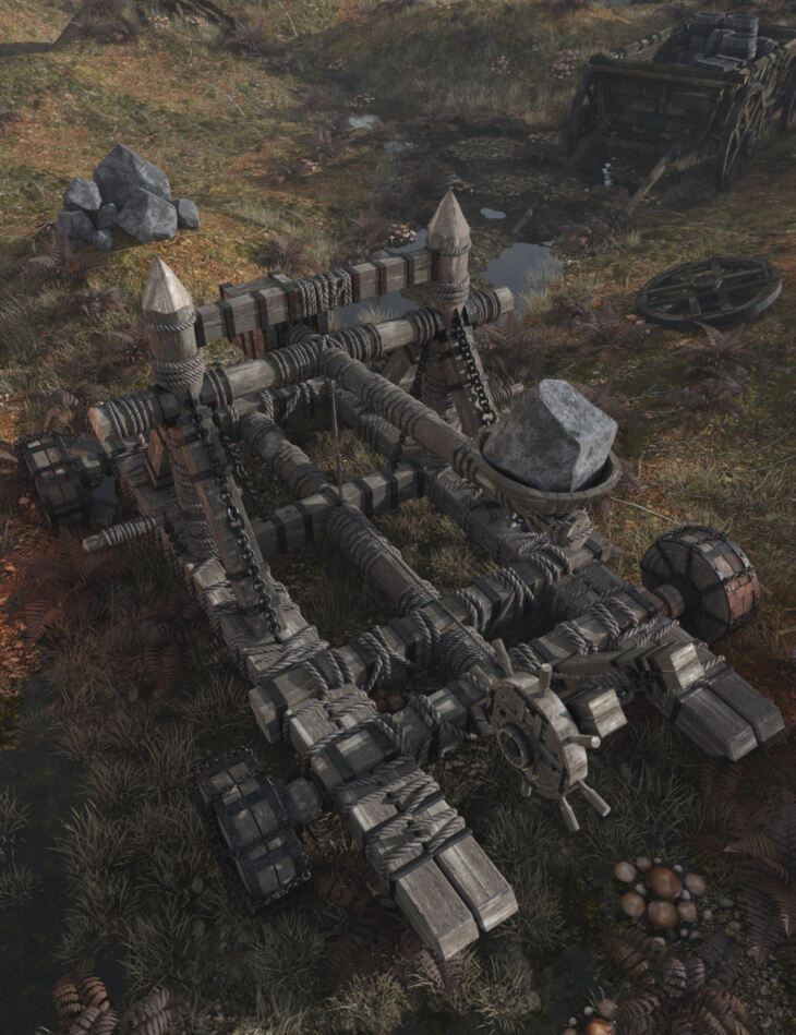 This collection includes 4 catapults with shootable boulders and 1 pile of projectiles for 3Delight and Iray.