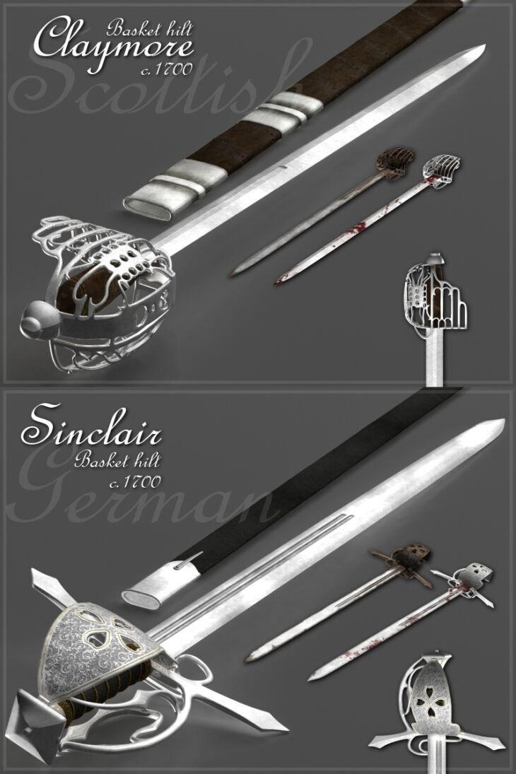 Each sword type has parents for both hands of V4 and M4 as well as parents to the right and left hip for the scabbards. They also come with 3 different textures, normal, bloody and rusty, supplied as .mc6 files for Poser and .dsb files for Daz Studio.