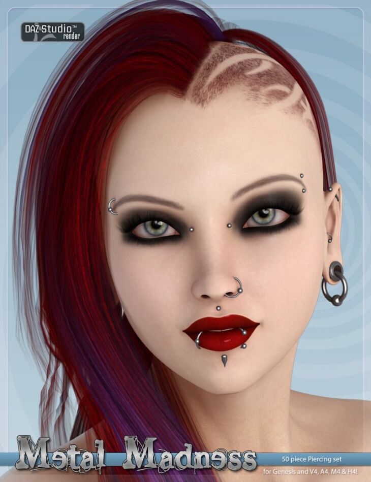 Contains 50 smart prop ear and facial piercings, including six pairs of Flesh Tunnel/Plugs and two custom earlobe morphs and transparency maps included for many Gen 4 and Genesis Shapes!