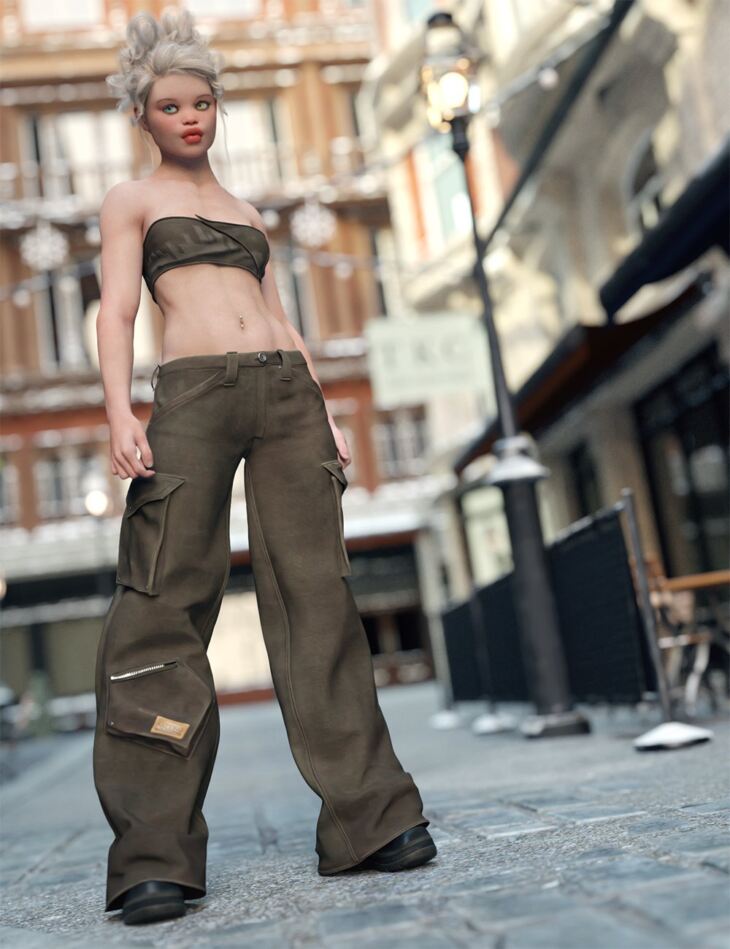 Metro Style is an urban set that includes a Tube Top, with matching squeeze / flatten morphs, a pair of wide-leg Cargo Pants, with open and style morphs, and chunky, platform Sneakers.