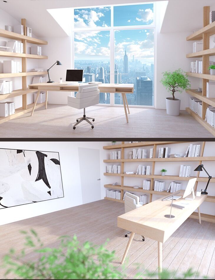It includes a stylish modern Desk and chair, bookshelf, and other props in the scene.