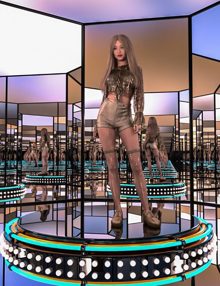Three different room models of mirrored walls, floors, and ceilings, as well as two different stage props. Each room and stage contains different lighting elements that reflect into infinity for an exciting, bright, colorful render.