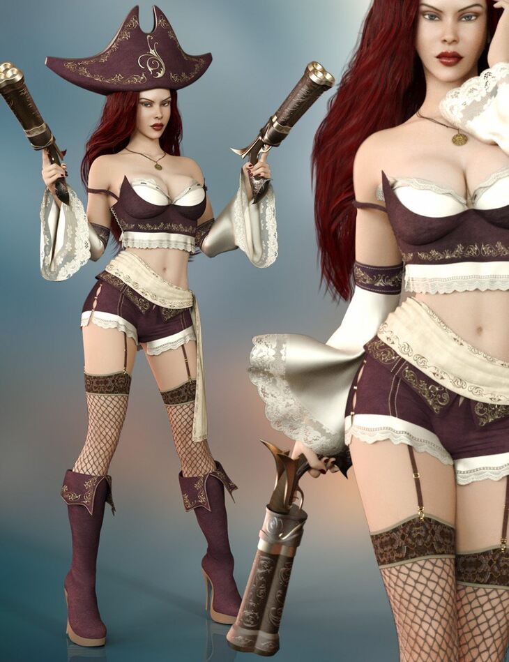Misfortune is a fantasy pirate coustume set designed for Pretty Base NG 8 and Genesis 8 Female(s).