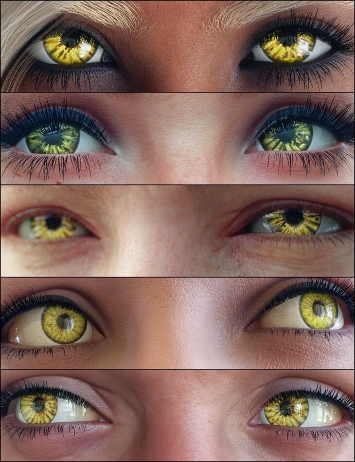 MMX Beautiful Eyes 07 for Genesis 9 is the yellow eyes mega pack for your regular and fantasy type renders. Every iris and sclera is different and unique from all the rest, so no two are the same. There are 100 yellow irises total divided in to 10 groups and 40 sclera divided into 20 red and 20 yellow.