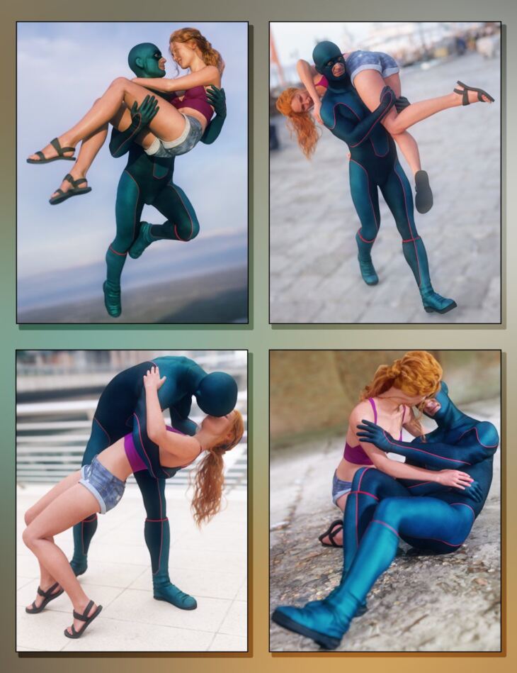 With this set, you get 15 paired poses for the Genesis 9 base masculine and feminine shapes and 15 paired poses for Michael 9 and Victoria 9.