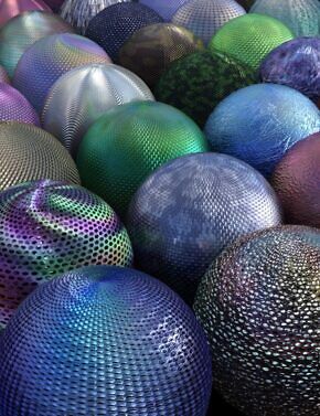 MMX Sequins and Sparkles for Iray gives you 115 unique, single and multitone, refraction-based color presets. These color presets will only be visible when rendered in Iray but give you beautiful results that are truer to real life. The look of the colors on the surface will depend highly on the shape of the surface, camera angle, and lighting.