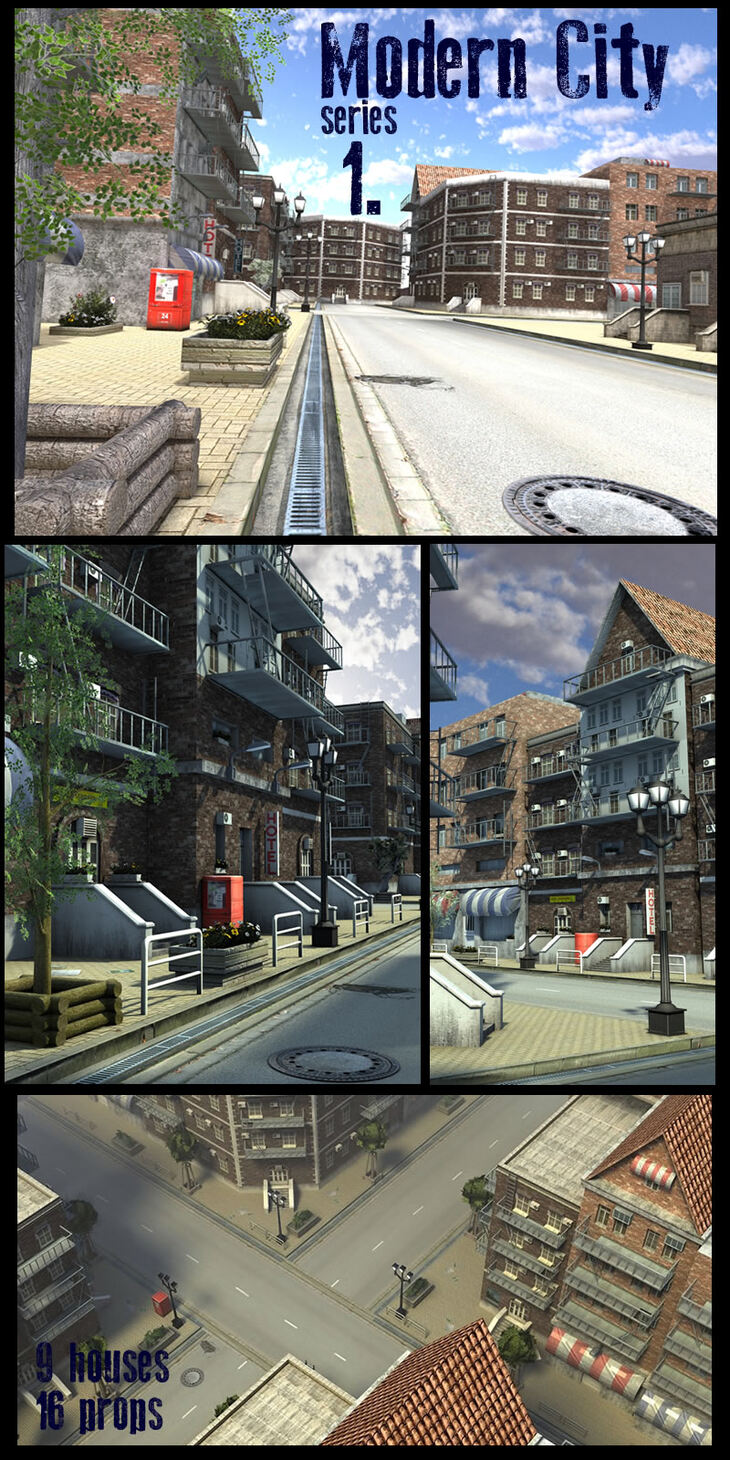 First parto from our Modern CIty Series include complete scene with 9 houses, 16 props in pp2 format.