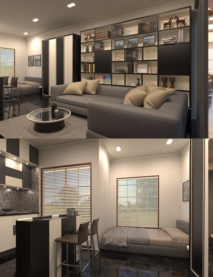 The Modern Compact Living Suite is a meticulously designed space that merges functionality with sleek aesthetics, making it the perfect choice for small urban homes or studio apartments.