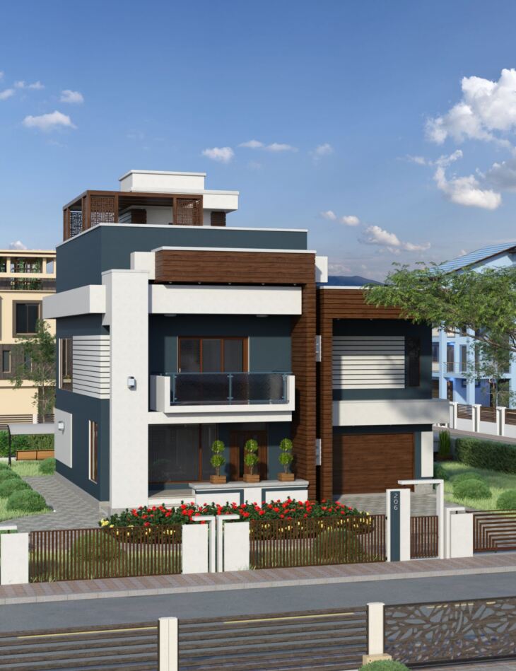 Modern House 4 is a contemporary two-story house with a balcony and a garage for two cars. The set includes a house and a fenced area, plus sofa, tables, chairs, fireplace, flower bed plants, and acacia tree props. The set includes six paint colors.