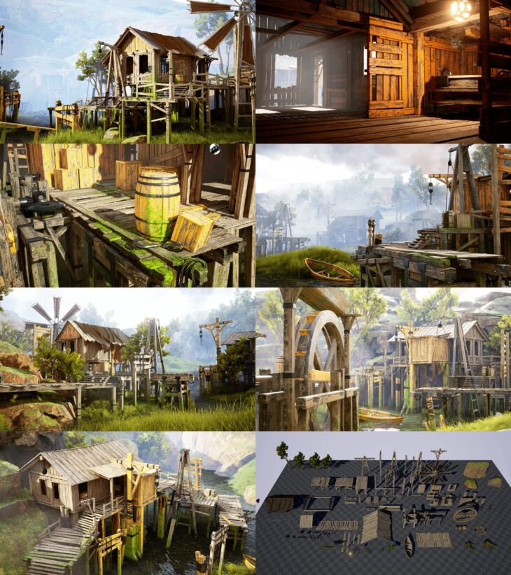A collection of highly detailed modular wooden structures, props and foliage. Can be used to create swamp environment, slums, shacks, water mill, river docks.