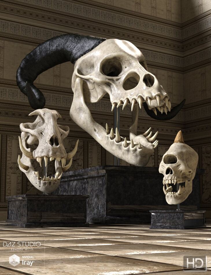 Take your fantasy renders to the next level with the Monster Skulls HD prop set. The set includes 3 highly detailed skull props with included display stand. The Dragon, cyclops and tusker skulls come complete with hand crafted materials and level 4 HD morphs. Lower resolution texture maps and presets are also included.