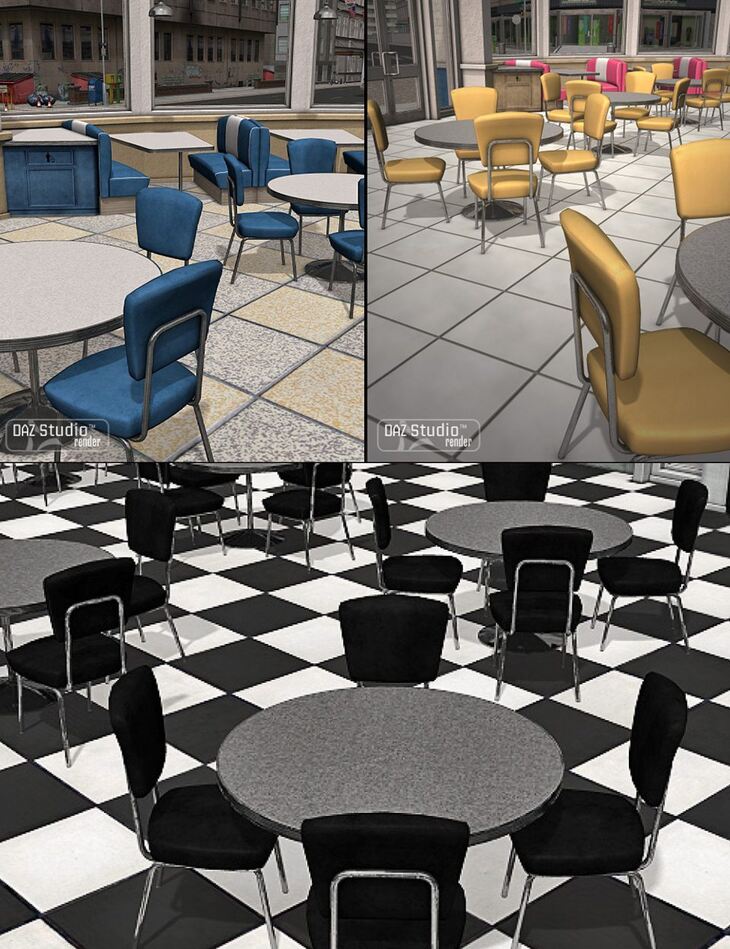 • Moonlit Moonshine's Diner Interior Hip Joint: A classic blue palette and checkered floor bring the flavor of the fifties to Moonshine's Diner Interior. Hip Joint is a complete add-on texture for this 3D retro diner set.