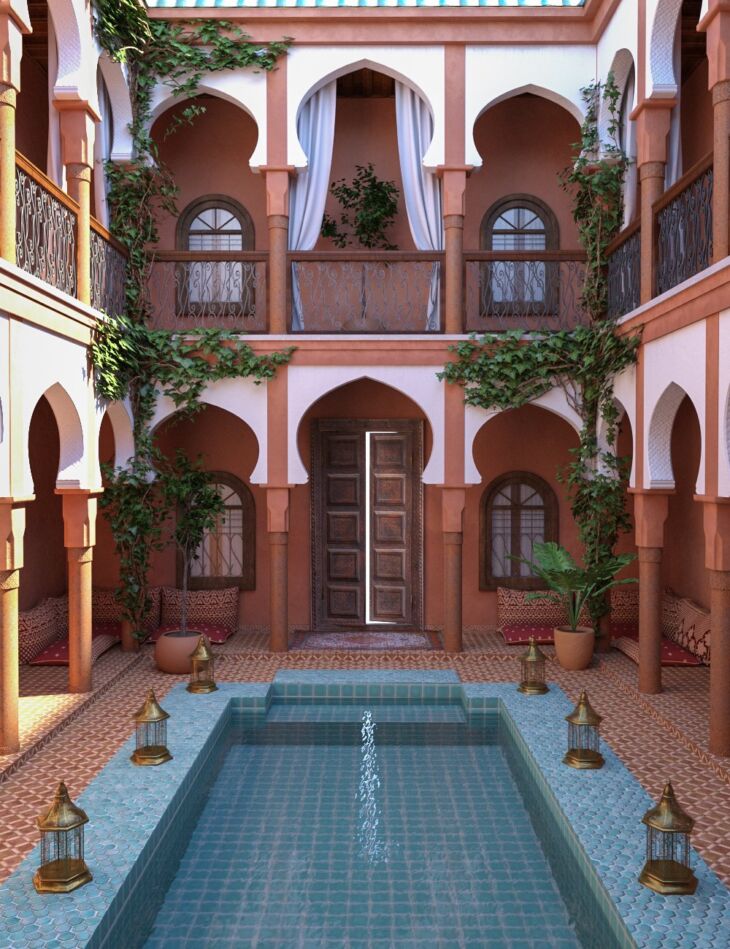 The Moroccan Courtyard Place creates a unique Moroccan atmosphere with a courtyard, a rug, pillows, a lamp, a door (that can open or close), 2 different plants, 2 different ivy plants, etc.