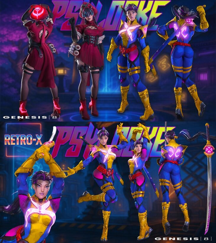 Both versions of Psylocke in one clean package — combining fierce energy with stylized throwback flair. Built for Genesis 8 Female and optimized in-house for flexible posing and crisp render results.