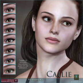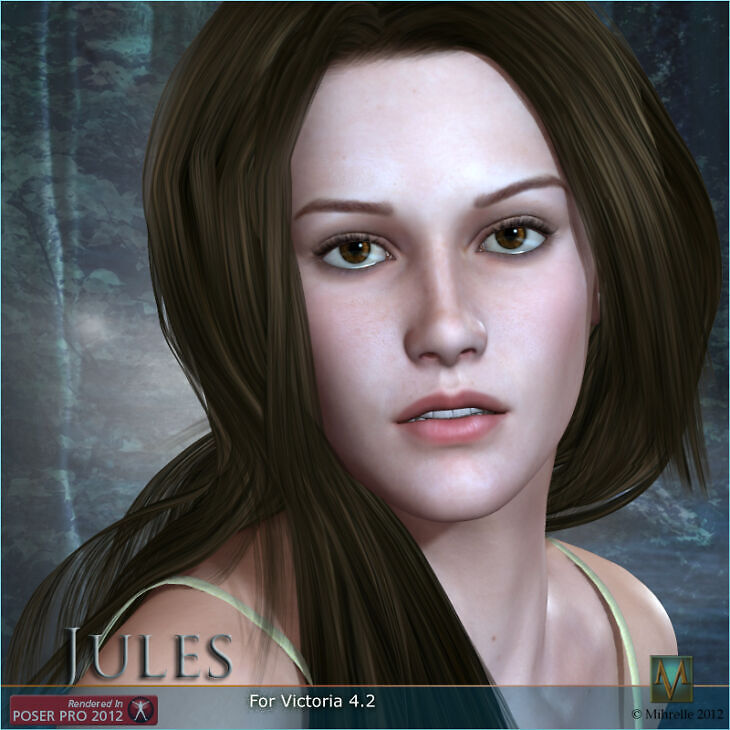 Her looks suit a wide variety of scenes from 'girl next door' to vampire to romantic to fairytale. All Make-up options are provided with and without hair mats. Jules includes both Poser and Daz MAT files.