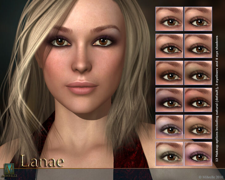 Lanae is an extremely beautiful and versatile character for V4. She has 2 complete head and body morphs using Victoria 4++ and Aiko 4 morphs. She looks good with any hair colour- blonde, redhead or brunette, she has lots of eye colour and make-up choices and has tattoos and elf ear options.