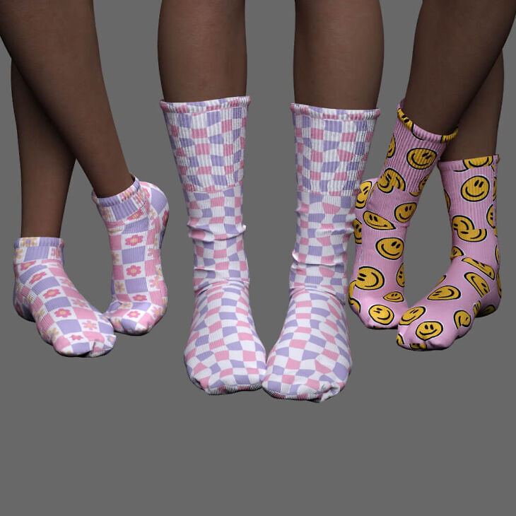 Add a touch of style and cuteness to your renders with this set of patterned women’s socks! This pack includes 4 different sock styles (short, mid, and long lengths) compatible with Genesis 8 Female and Genesis 9, all optimized with dForce for realistic draping and fit.