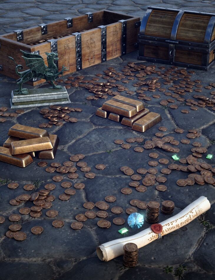 Featuring a strongbox with an opening lid, latches, and handles, and over 20 other unique and detailed treasures, ranging from an exquisitely framed portrait and statuettes to scattered coins and ingots, this set will turn any mundane area into a priceless vault.
