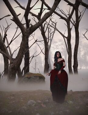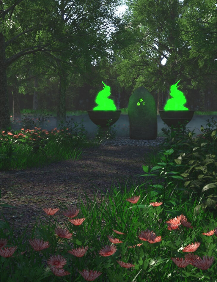 In the middle of a dense forest lies a mysterious rock with glowing green symbols and two vases emanating energy that illuminate the place.