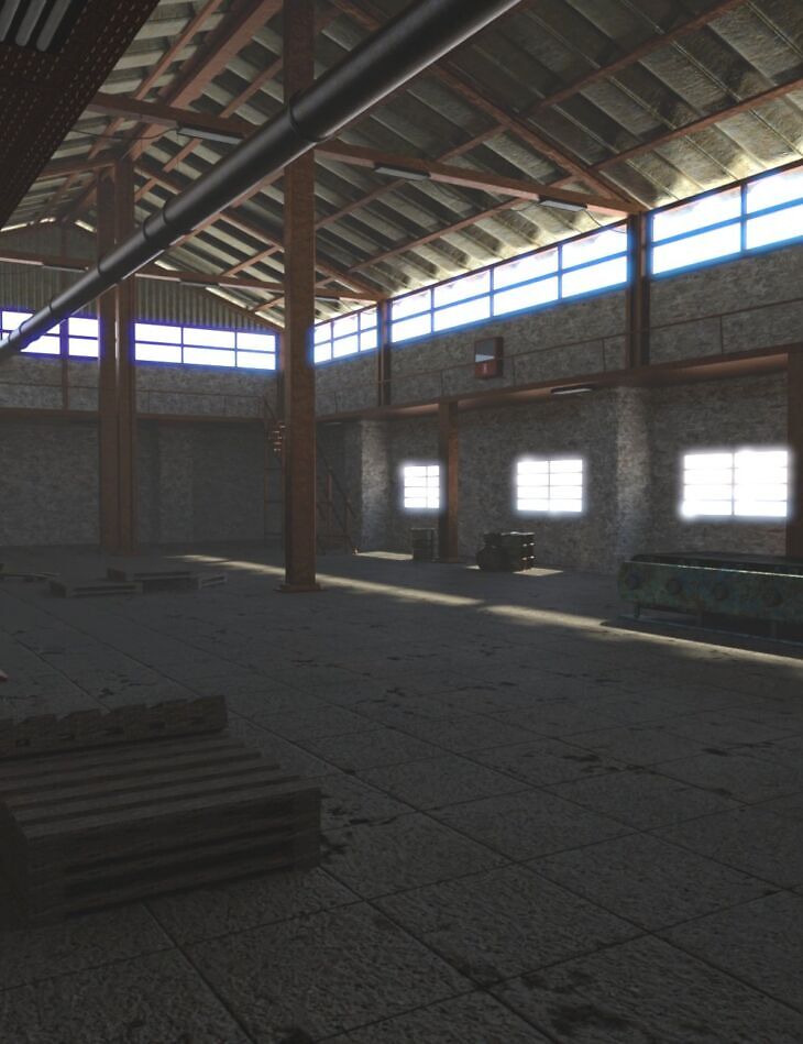 This is a factory that is idle with rusty equipment scattered around the place, but the lighting still works.