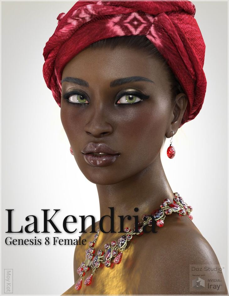 LaKendria is a beautiful character for Genesis 8 Female with a beautiful skin tone, she is a custom morph sculpted using the base figure. She has the basic morphs and doesn't need extra packages to work.