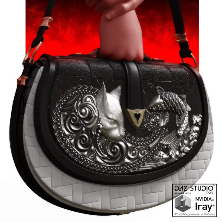 Handbag fully rigged, fit Genesis 3 and 8 Female(s), have 2 pose set and one Iray material preset.