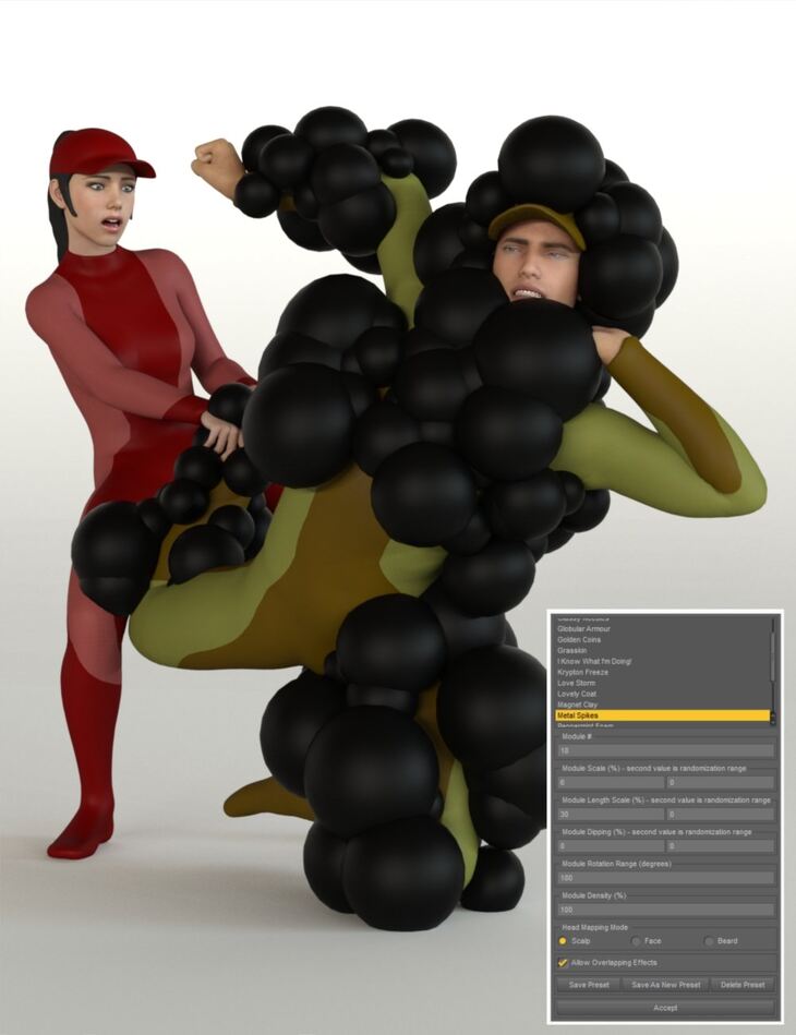NebulaFX - Modular Effects is a collection of 16 configurable effects you can apply to Genesis 8 Male/Female figures.These effects allow you to create quick rendering geometry on individual figure surfaces (chest, abdomen, pelvis etc, and even scalp-only, face-only, beard-area-only, individual finger sections etc), from one of the provided modular shapes like spheres, cubes etc, or more sophisticated modules like crystals, hearts and more.