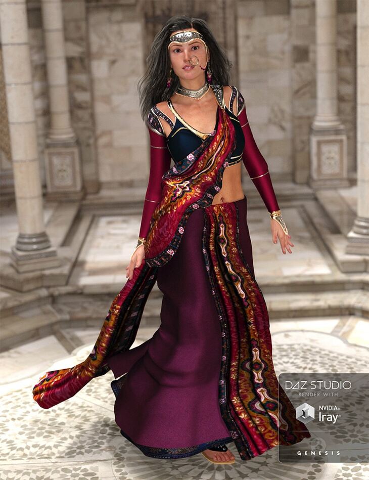 This new outfit for genesis 2 Female(s) and Genesis 3 Female(s) was inspired by existing oriental clothing. It comes with a top, skirt, sari, sandals and several jewelry pieces for neck, head and hands. Ornate earrings, a nosechain and nosepin are also included.