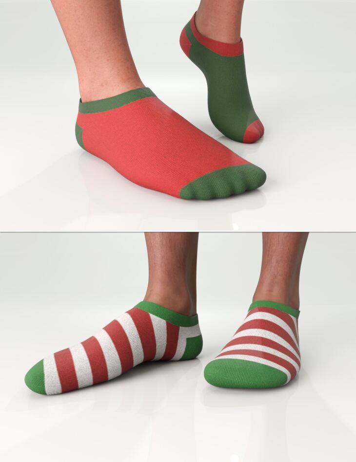 This pair of ankle socks comes ready to use for various supported characters with 3 holiday patterns and 3 textures for which you can change the base color/translucency and overlay colors to customize to your liking.