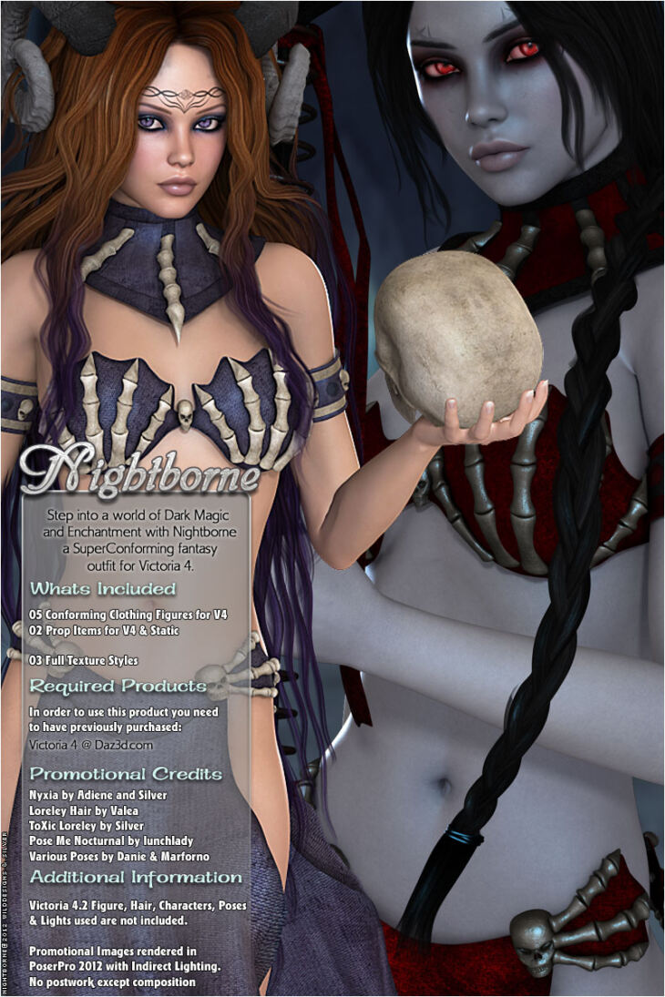 This set consists of 05 conforming items for Victoria 4 - Anklets, Armbands, Bra, Collar and Skirt. Also included is a prop Staff and Skull!