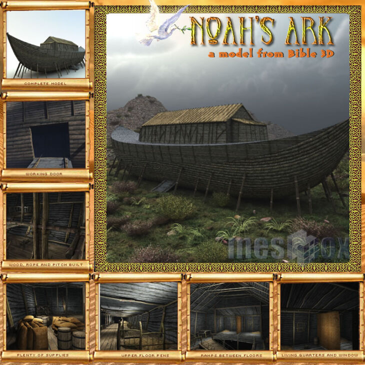 Noah's Ark 3D is a vast and detailed ship of the ancient world, created from logs and pitch made from the cedars of Lebannon. The ark can sit on a set of land posts (while Noah is working on it), and has a large door that is open. Close the door, and its ready to sale the world. Inside, multiple floors can store your animals. Plenty of hay, feedsacks and room for more gear. Small living areas are at the front of the ship.