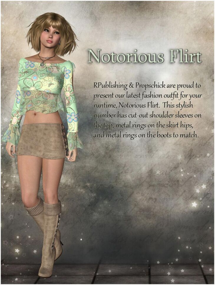 PropsChick and Rpublishing present Notorious Flirt for Victoria 4! A flirty number prefect for your runtime fun! this outfit has cut-outs at the shoulders and metal rings at the hips of the skirt and the sides of the boots.