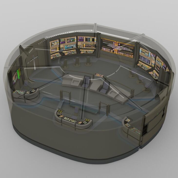 The rear stations can be reconfigured to display any of the ship`s functions. Three chairs on the left and three chairs on the right allow crew members to access the ship functions.