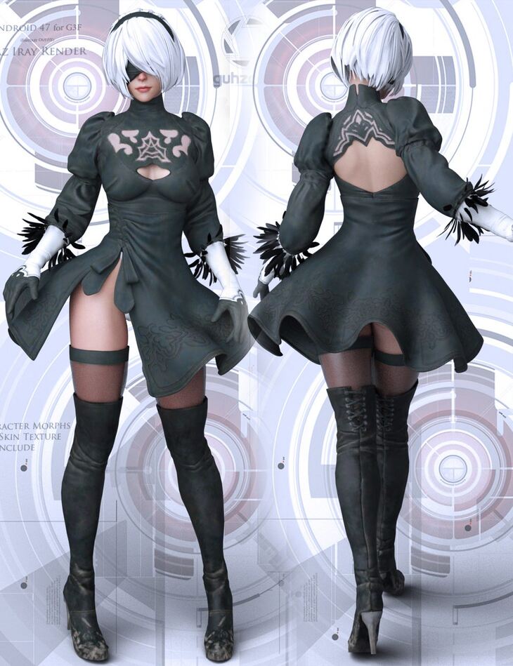 Android 47 for G3F for Daz Studio. It comes as Character (Body, Head Morph and G3F Material preset) and Outfit: Dress, Boots, Gloves, Mask and Hair.