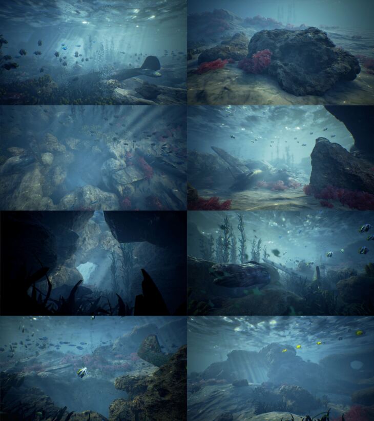 An underwater environment with rock meshes, terrain materials, algae, schools of fish, including an animated eel, particle effects, a submarine wreckage and downed Japanese WWII planes.