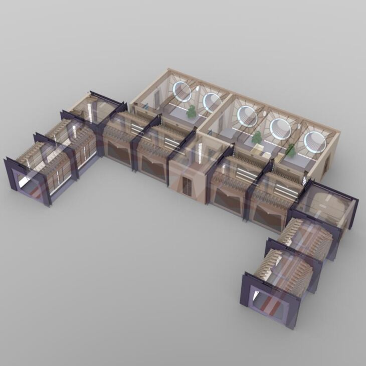 This model includes the room, exterior hallways with opening doors, and separate furnishings. You can add the fully furnished room to the scene or load only the room and decorate it yourself.