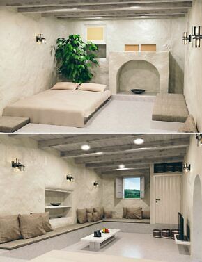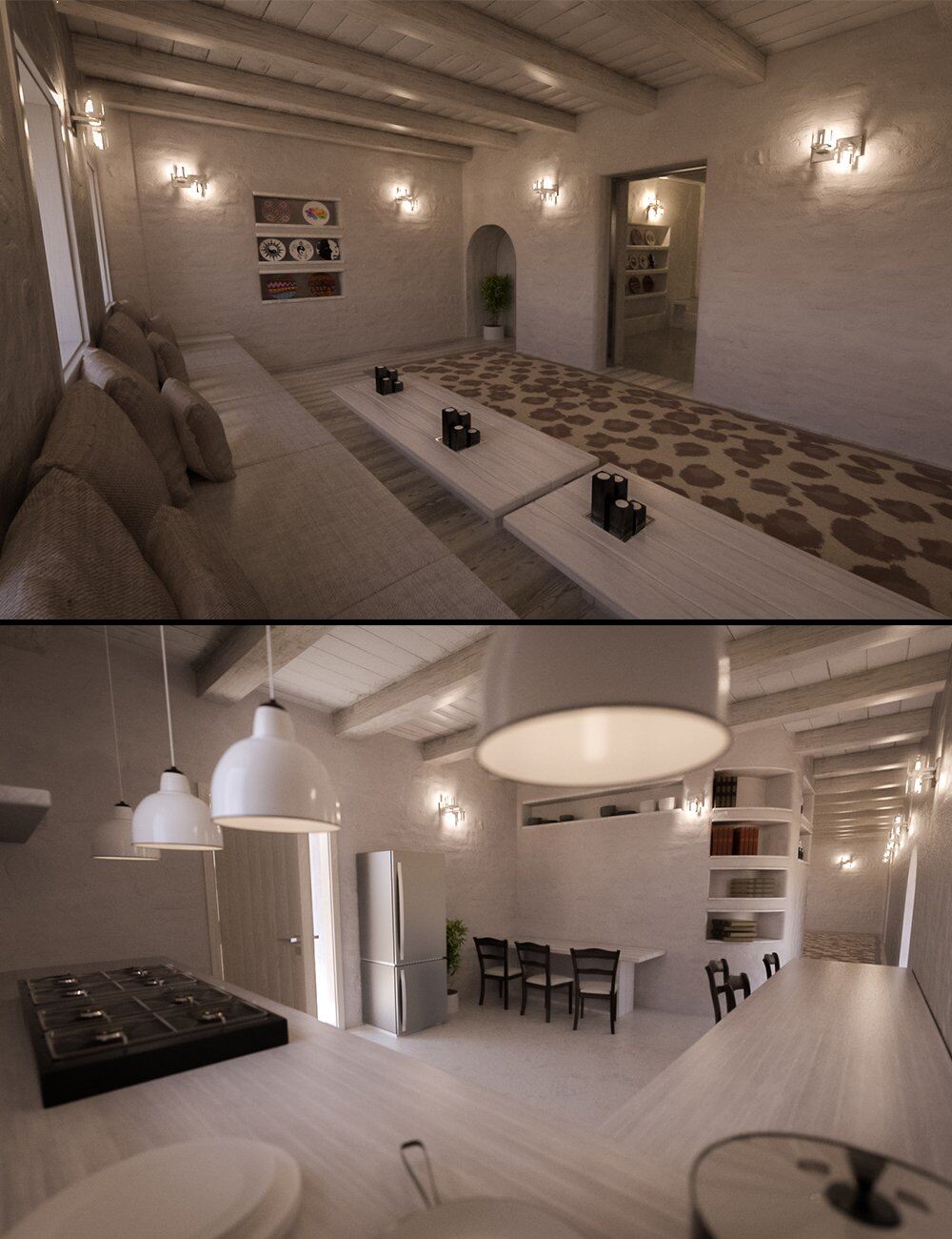 Oikos Living and Dining is a large, simple, and elegant indoor environment with a kitchen, dining area, living room, bathroom, and stairs to a second floor. This set represents the classy and stylish design of the Greek Oikos interior with modern props for a classic interior that's popular with every guest.
