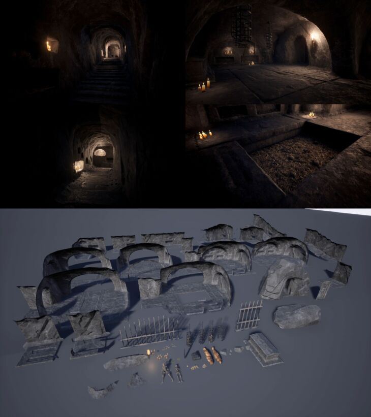 Old Catacombs - is a modular environment suited for the first-person and top-down games. It contains sets of rooms, stairs, and doorways which will help you build kinds of rooms and hallways. A set of prop add details from skeletons to candles or lever.