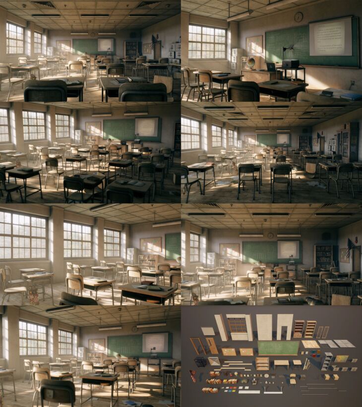 This is a package for an old classroom scene that contains about 200 assets for your games. Building materials are supporting different effects like dynamic dirt,  adaptive tessellation etc. Most of the materials are instances so it is easy and fast to change any parameter.