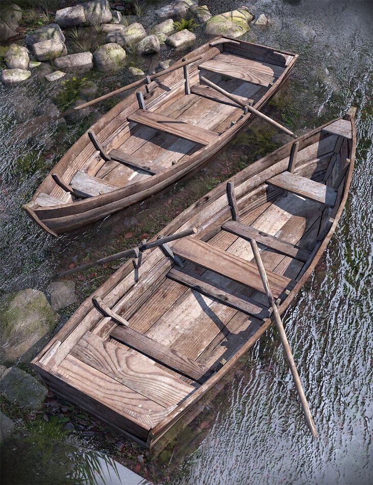 Old Rowboat includes a boat figure with rigged oars for your characters, as well as a prop version. Also included is three broken boat props; a ruined hull, a bow and a stern. Two textures sets, one clean and new and one weathered, completes the set.